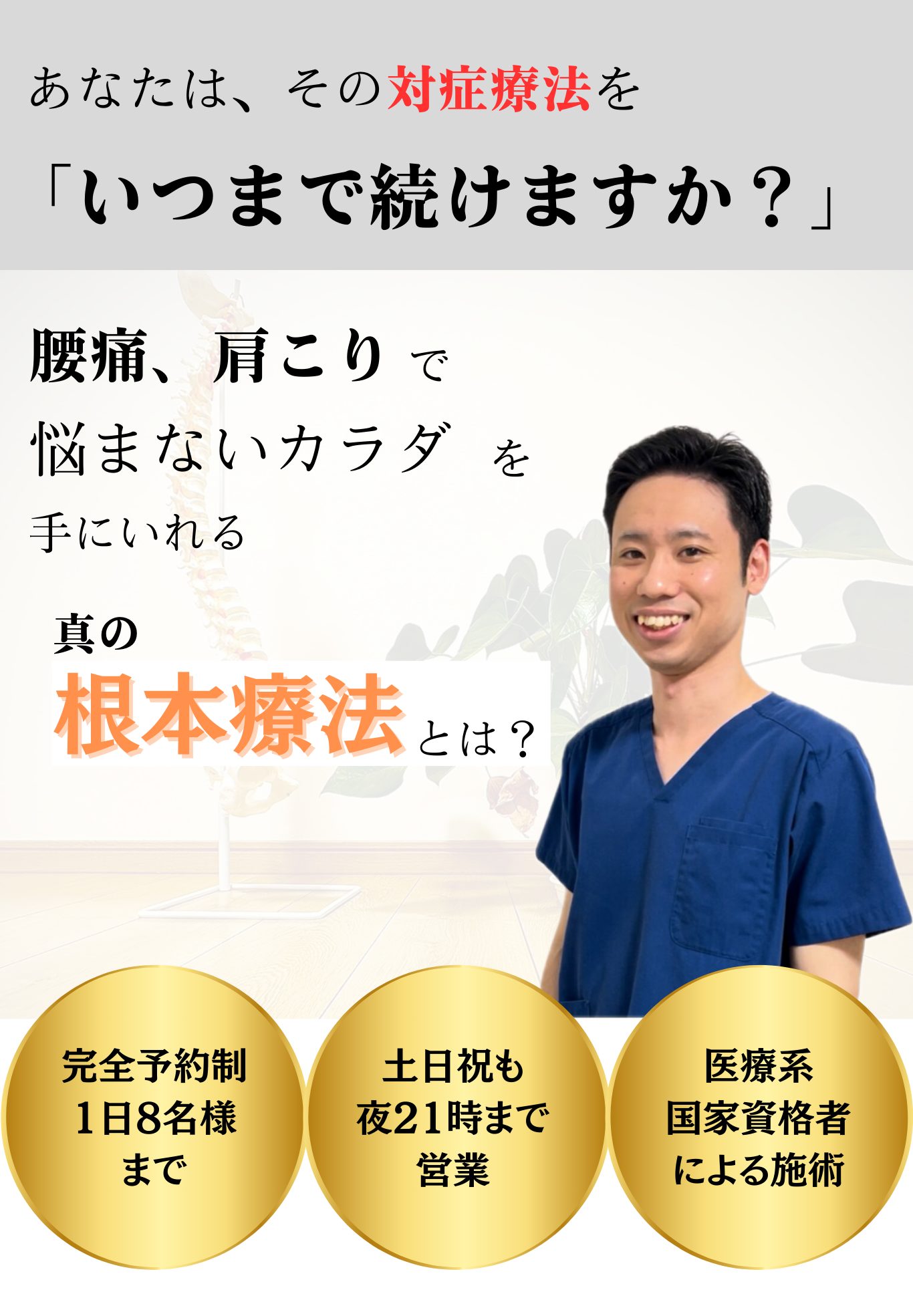 近年は、「根本改善」を謳う整体院や整骨院が増えてきました。ですが、手段が整体、整骨である以上、それは根本療法にはなり得ません。
